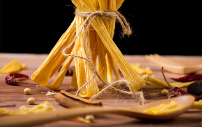 一、腐竹生產(chǎn)工藝流程1、選豆去皮選擇顆粒飽滿的黃豆為宜,篩去灰塵雜質(zhì)。將選好的黃豆,用脫皮機粉碎去皮,外皮吹凈。去皮是為了保證色澤黃白,提高蛋白利用率和出品率。2、泡豆將去皮的黃豆用清水浸泡,根據(jù)季節(jié),氣溫決定泡豆時間:春秋泡4~5小時,冬季7~8小時為宜。水和豆的比例為1∶2.5,手捏泡豆鼓漲發(fā)硬,不松軟為合適。3、磨漿甩漿用石磨或鋼磨磨漿均可,從磨漿到過濾用水為1∶10(1公斤豆子,10公斤水
